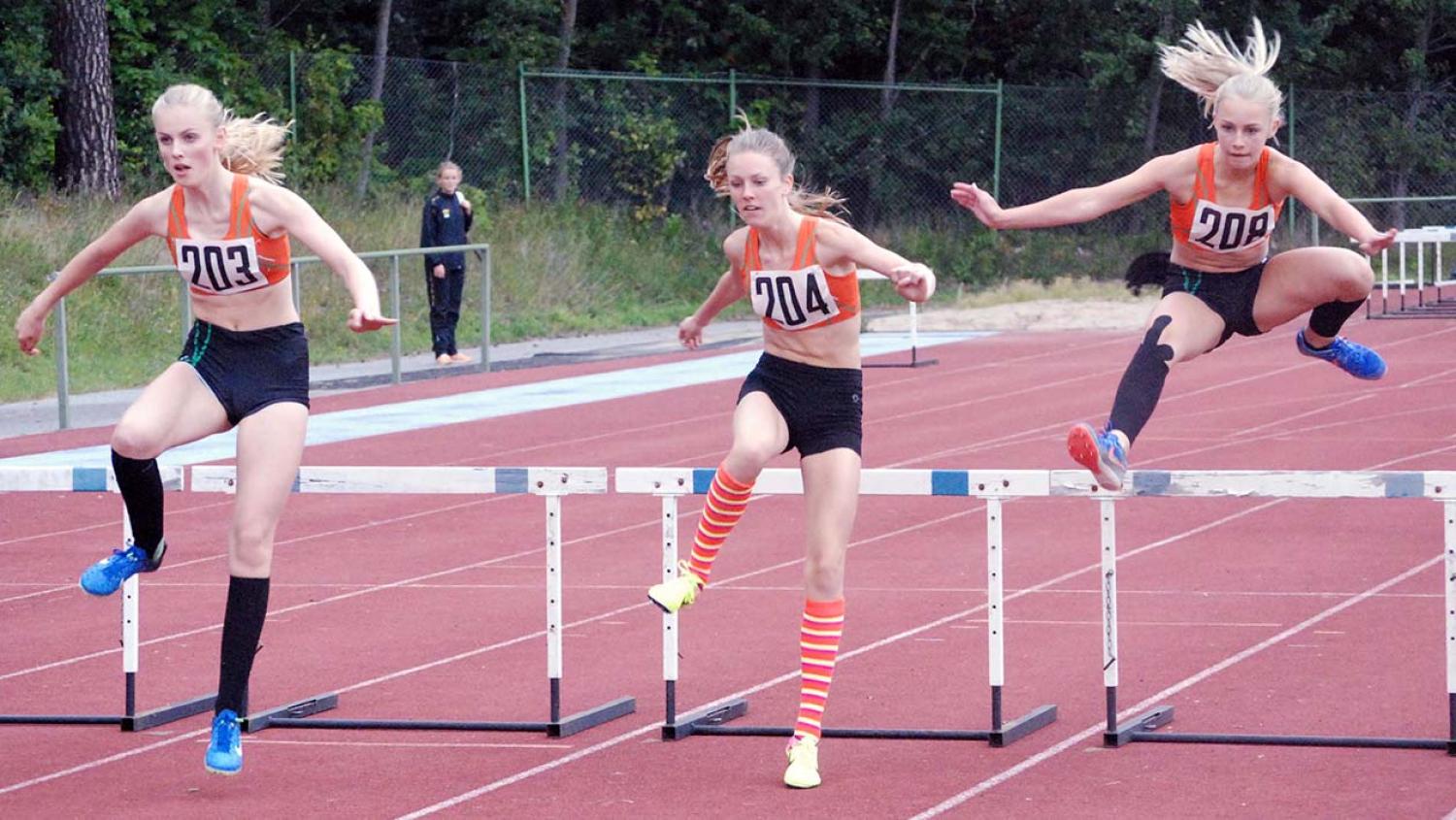 Ren Åsbrouppgörelse på 200 m häck. Här på näst sista häcken fr.v. Irma Kron(3:a), Jenna Mogren(2:a) och segrarinnan Nanna Frih. Foto: Börje Nordin