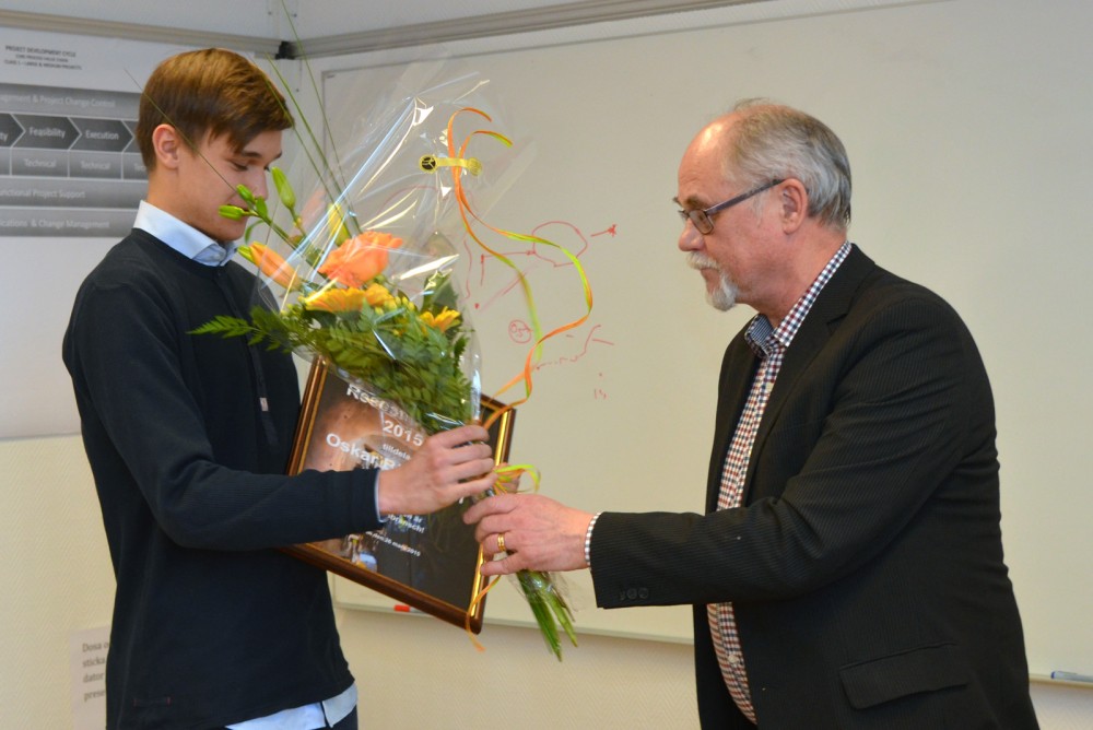 Oskar Bäckgren tar emot stipendiet ur vd Bengt Sundelins hand.Stipendieutdelningen inleddes med korta tal av Zinkgruvan Minings vd Bengt Sundelin och av Robert Eriksson från Lundin Mining. Så bjöd musikern och gruvföretagsanställde Tom Nordahl på några klassiska låtar, innan det dags för Bengt Sundelin att överräcka stipendierna.