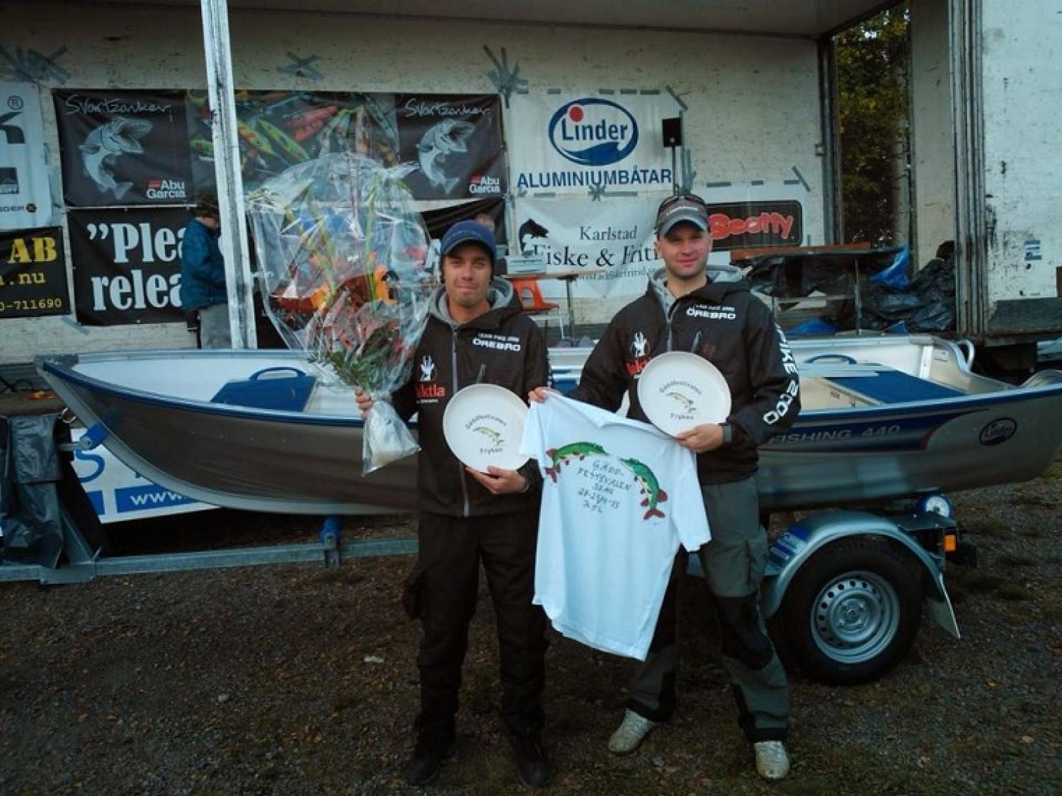 Micke Norèn och Fredrik Johansson från Hallsbergs Sportfiskeklubb stoltserar efter vinsten i Gäddfestivalen 2013. Foto: Privat
