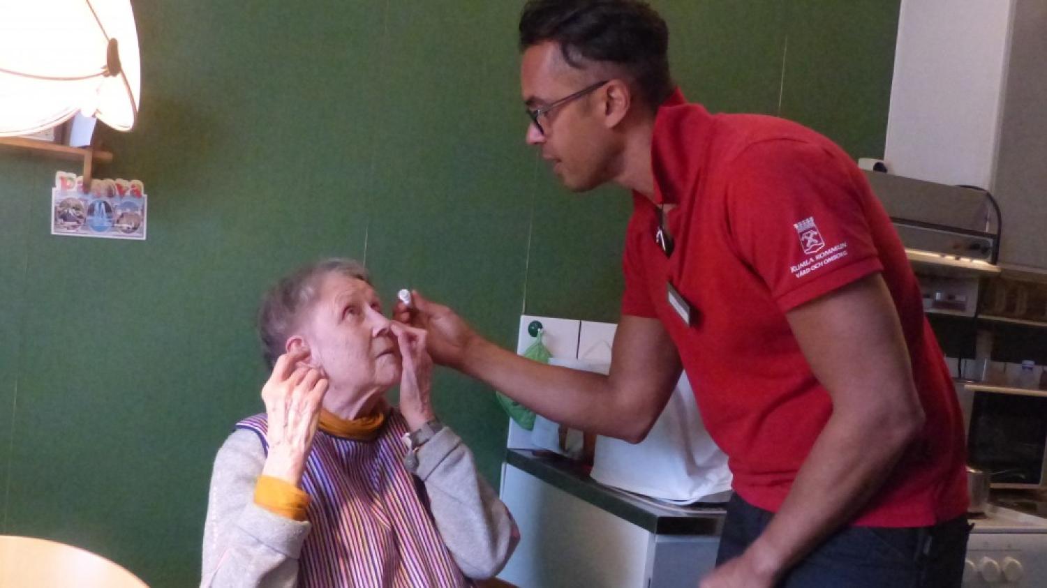- Jag förstår inte stressen, säger Paulo Boskär, undersköterska i hemtjänsten, som här ger Gunvor Påle ögondroppar. Foto: Lars Litzén