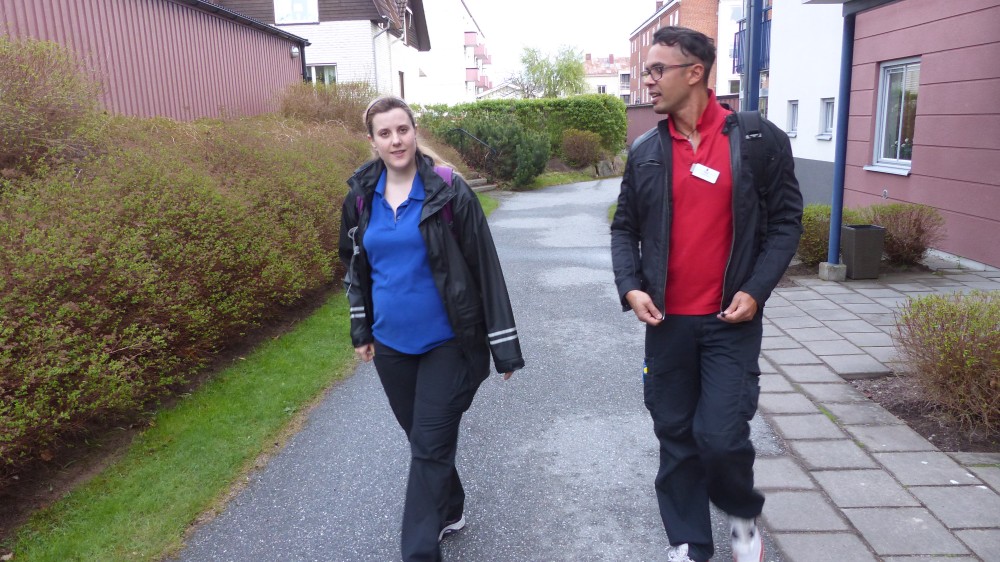 Paulo Boskär har 14 besök på sin kvällslista, han går målmedvetet, ganska snabbt, mellan portarna i en slinga som planeraren försökt få till utan för många omvägar. På vägen ringer han en kvinna som ska få besök om en timma, hon vill ha det så.