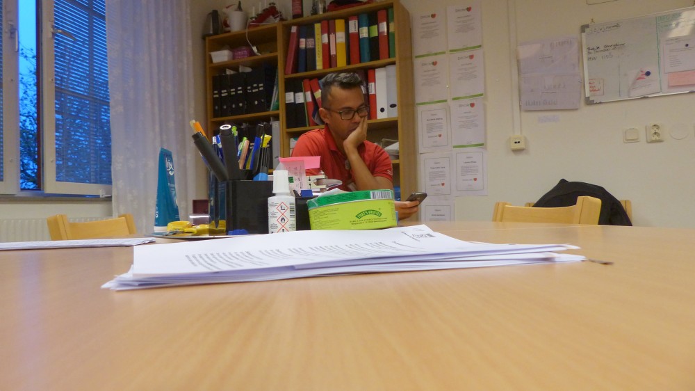 Vid 20:45 är vi tillbaka i Skofabrikens personalrum. Paulo Boskär skriver upp det kommande morgonskiftets namn på en whiteboard med telefonnummer, fyller på kaffe, gör nåt vid datorn.