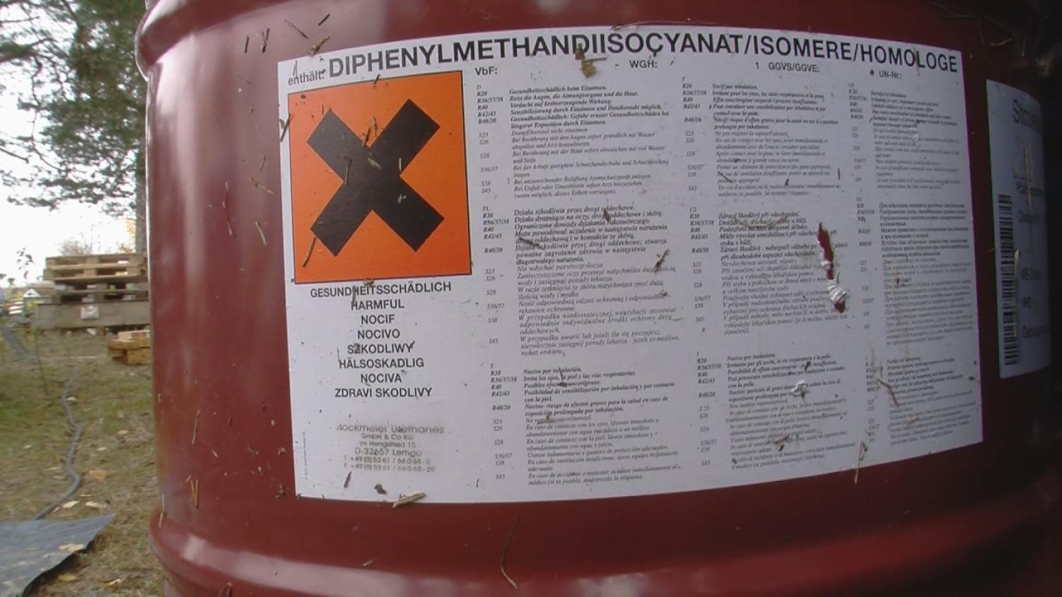 Etiketten på tunnorna anger att isocyanatet är hälsofarligt, att ångorna kan orsaka ögonskador och att kontakt med ämnet kan framkalla allergiska reaktioner. Arbetsmiljöverket har därför utförliga säkerhetsregler för hur det ska hanteras.