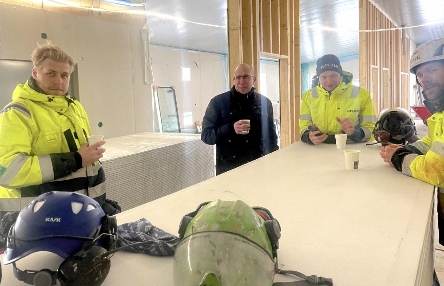 Taklagskaffe. Från vänster: Ludwig Vesterlund, Magnus Andersson (S), John Bergström och Mikael Eriksson, alla i byggkläder från huvudentreprenören, NA-bygg.