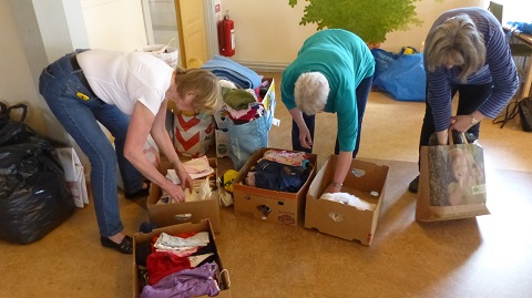 17 kvinnor gick upp tidigt på måndagsmorgonen, tog sig till församlingshemmet och bildade kedja för att packa babypaket. Vid 15-tiden kunde de pusta ut. Då stod 24 stora blå plastsäckar klara, fyllda med paket, åtta i varje säck.