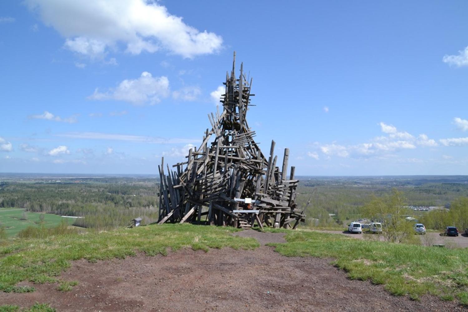 Lars Vilks konstverk ”Waaaall” på Kvarntorpshögen hade funnits där en längre tid. Men nu är det nedbränt. Foto: Kumla kommun