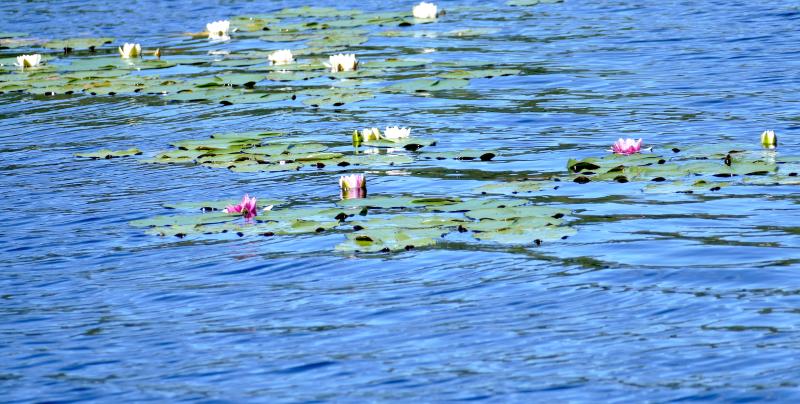 Det finns mycket näckrosor i sjön, mest av den vanliga, gula sort som brukar kallas Å-kannor, men också vit och alltså en del röda. De röda är ingen egen art, utan en genetiskt mutation av de vita.
