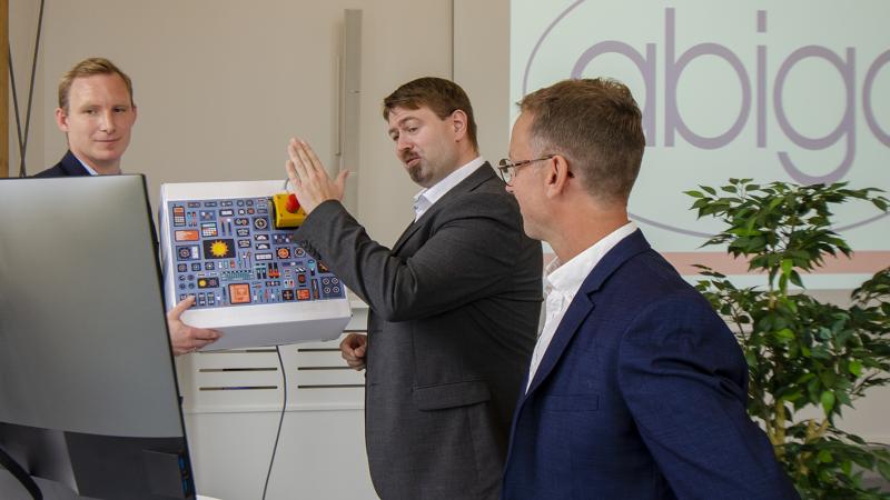 Abigos vd Fredrik Stenbäcker slår in knappen för solcellssatsningen. Projektledare Mattias Mattson (till höger) och Veosols Johan Ingvarsson övervakar.