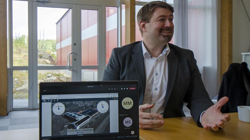 Vd Fredrik Stenbäcker. Skärmen i förgrunden visar solcellernas andel av företagets totala elförbrukning.