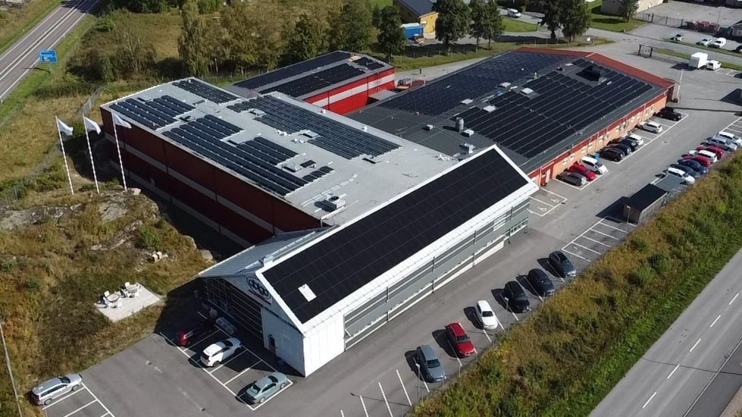 Anläggningen på Abigos tak är en av länets största solcellsparker.