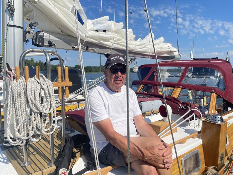 Bertrand Danielsson på sin vackra segelbåt. Båten, som är byggd på Åland, utgöra hans och hustrun Anettes bostad på sommaren.