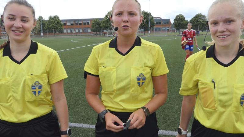 Svenska Fotbollförbundet skickade tre domare under utbildning från Stockholm till Hallsberg, Amanda Nylund Karman (i mitten) var huvuddomare med Amanda Davidsson och Vendela Högqvist som assisterande. - En rolig match att döma eftersom det var så jämt.