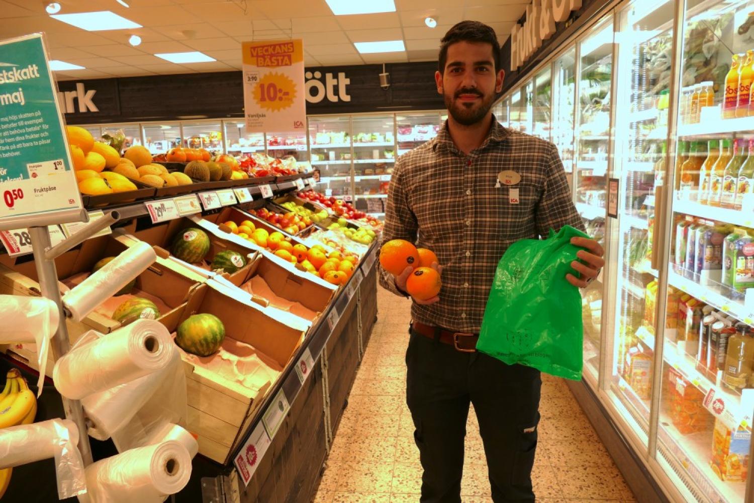 Handlaren Nick Zand Karimi, vill kunna använda matavfallspåsarna för frukt och grönt. Foto: Henrik Östensson
