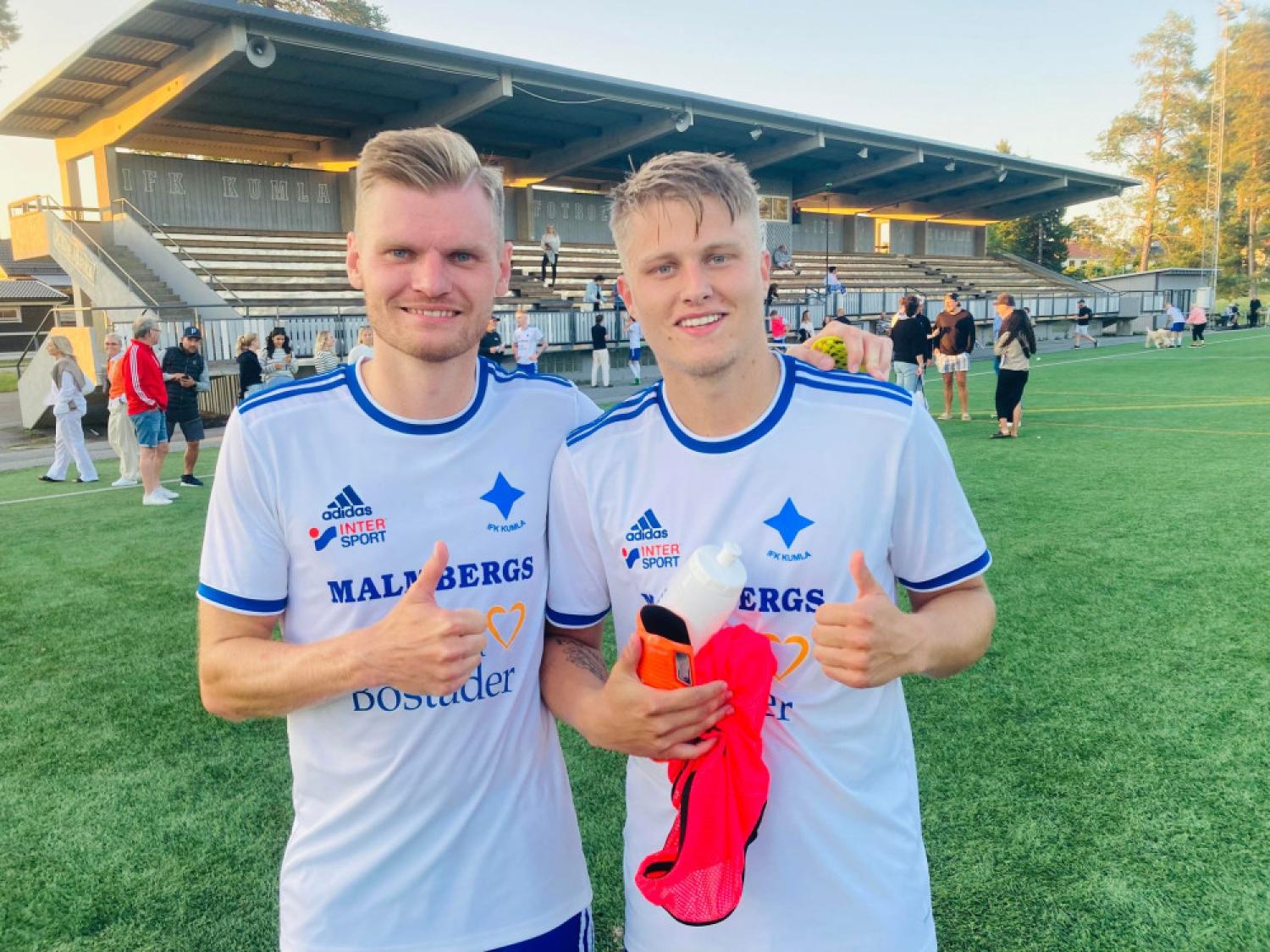 Joel Källgren och Rasmus Gustavsson Engdahl ger tummen upp efter tre nya poäng. Foto: Anders Björk