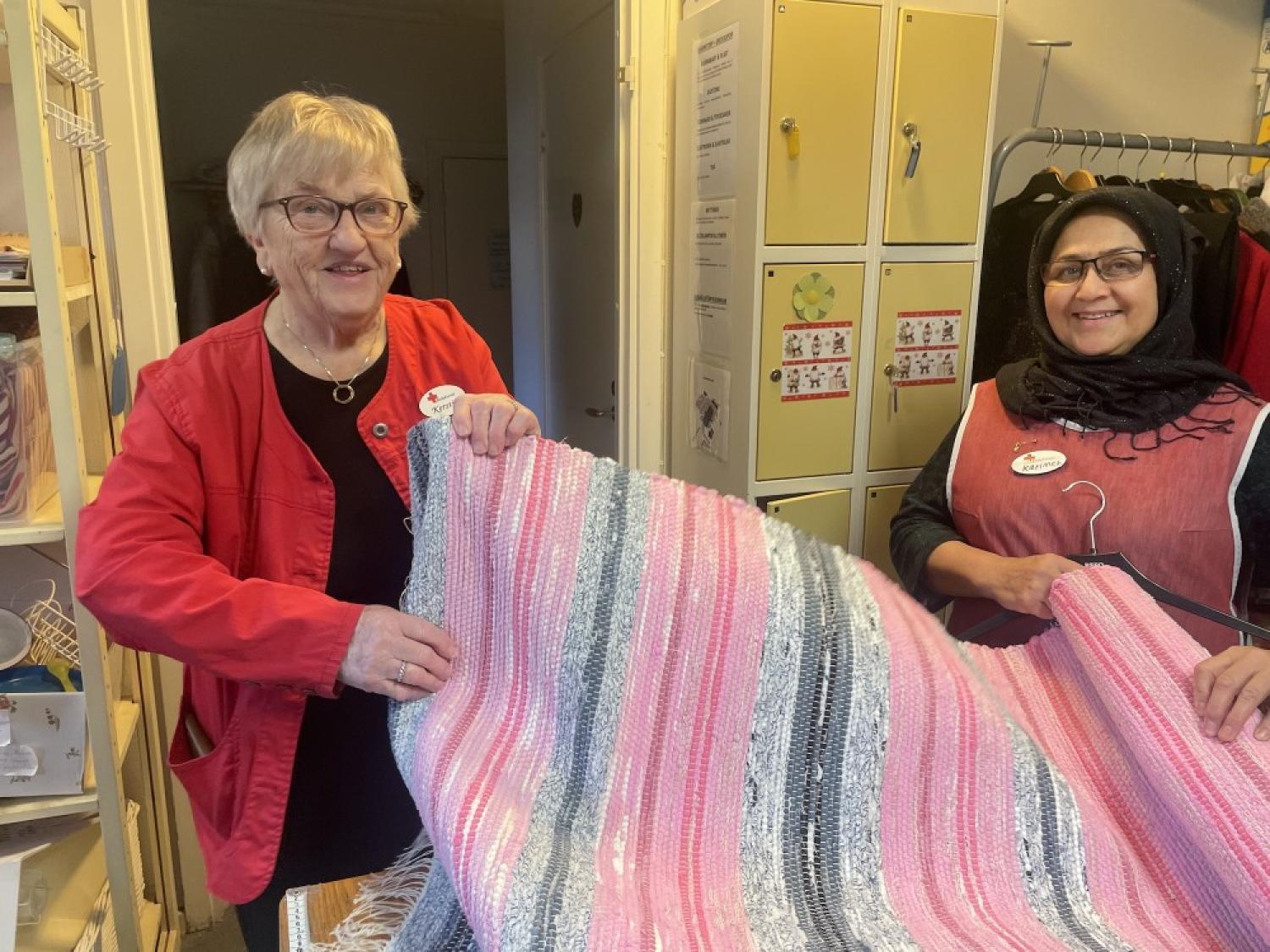 Kerstin Lundqvist Eriksson, och Karimeh Batari synar en matta som ska säljas. Foto: Henrik Östensson