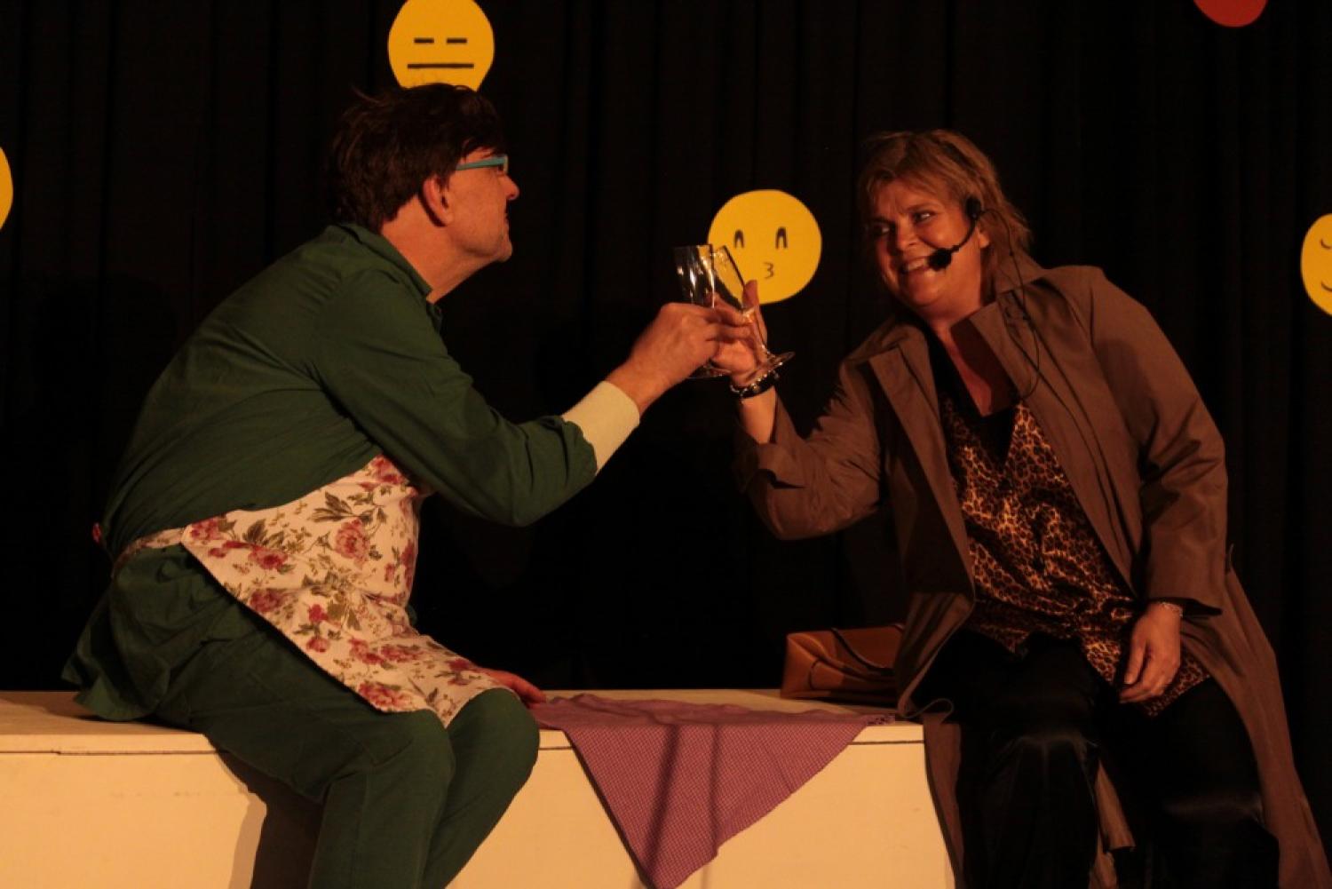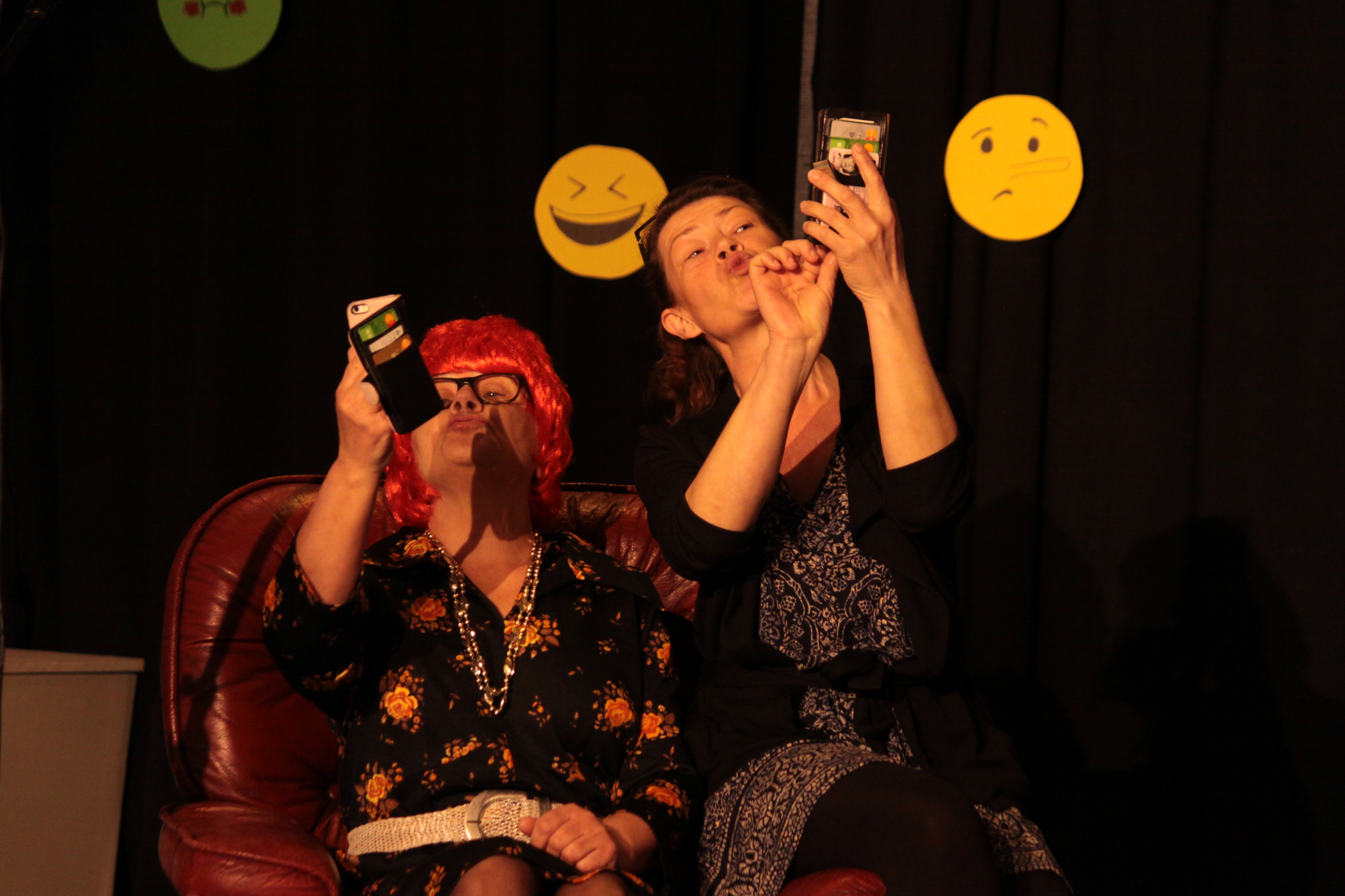 Rosa Jadeborn och Ingela Kjellgren tar selfies i revyn. Foto: Roger GrännsjöHumor i vården