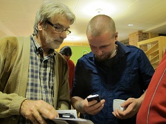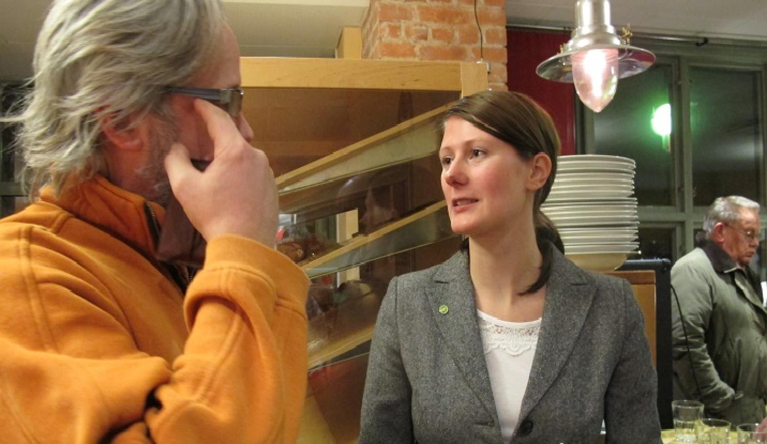 Mattias Bäckström, lektor i miljövetenskap och Lise Nordin, miljöpartiet, diskuterar engagemanget i Kumla mot uranbrytning. Foto: Kent Halttunen