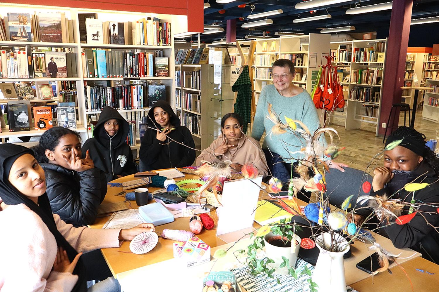 Varje vecka dukar Andrea Zarske–Borowski upp ett kreativt bord på Laxå bibliotek där ungdomar har möjlighet att prova på enklare handarbete. Foto: Josefine Milton