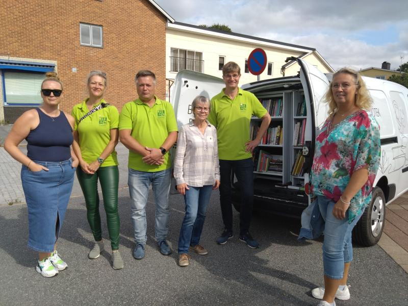 Therese Magnusson visar upp bokbuss och även familjecentralen för gäster från Laxå kommuns tyska vänort Grevesmühlen.