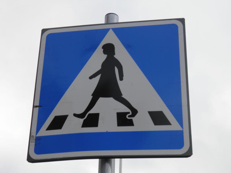 Vid övergångsstället vid järnvägsstationen har Fru Gårman bytt plats med maken, en emanciperad vägskylt.