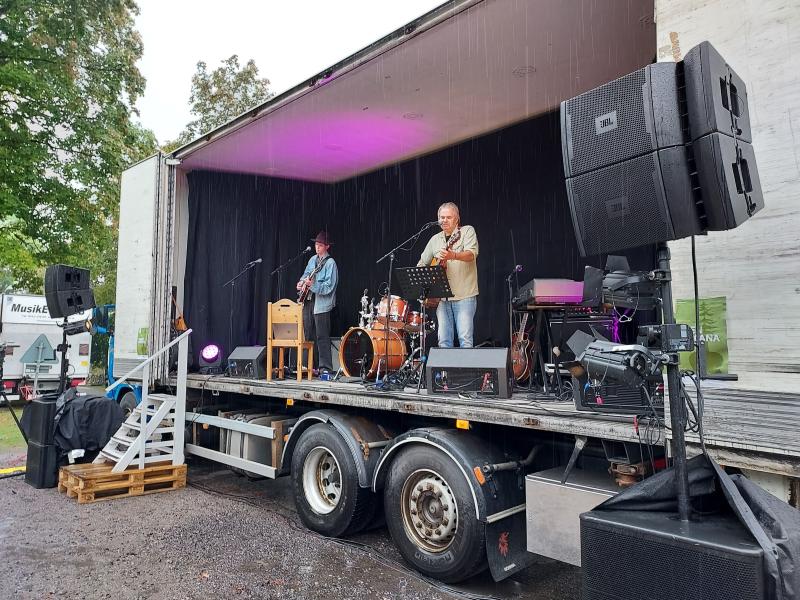 Musikerna bytte av varandra på det stora långtradarflaket framför Luripompa, Tiveds Handels sommarrestaurang. Först ut var Izak Danielsson Kihlström och Steve Eriksson som just avslutat några givande dagar på ett song writer camp tillsammans med sex andra deltagare.