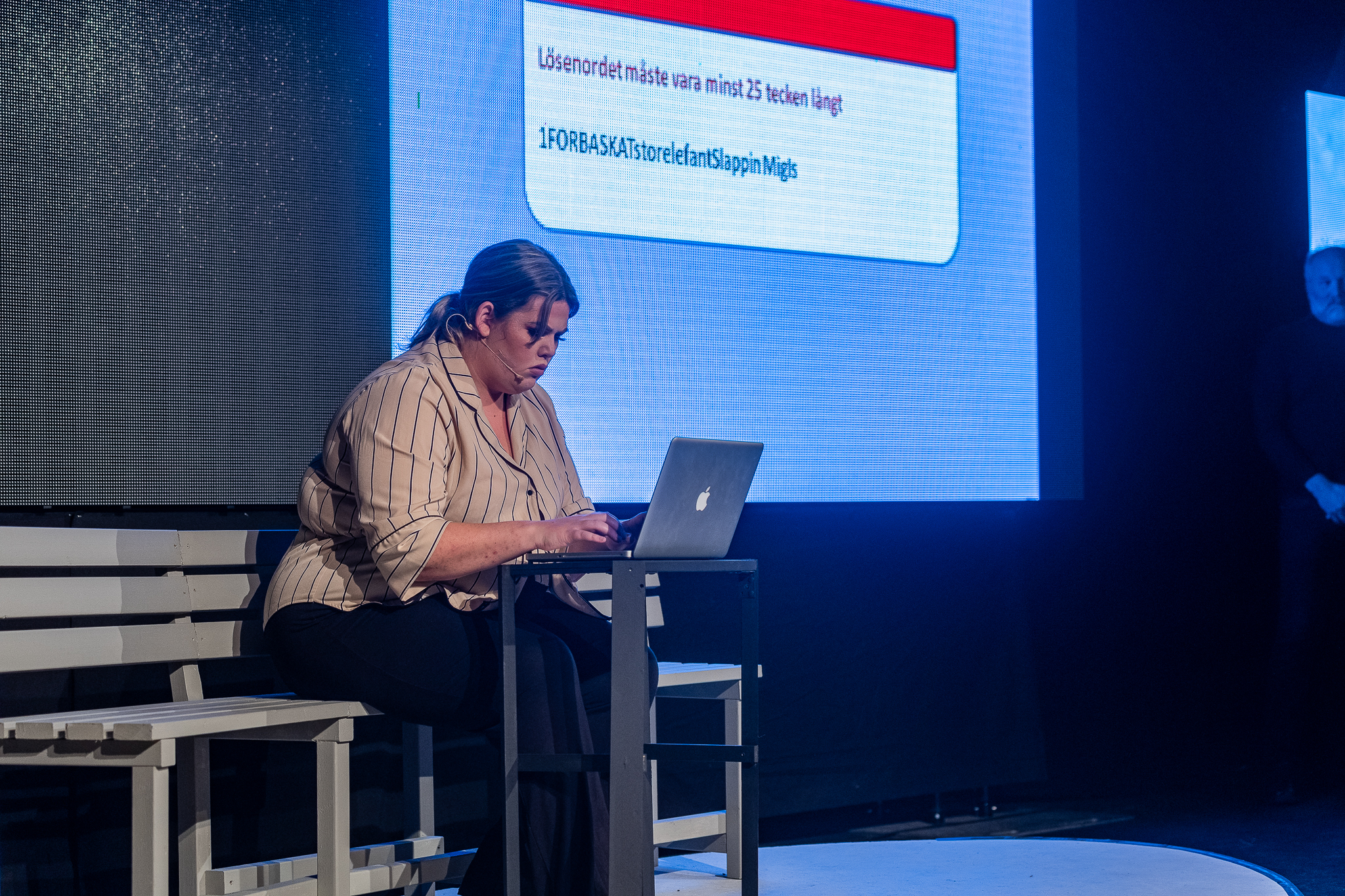 Sofie Dahlén i en sketch som belyser problemen med att skapa lösenord.En handplockad ensamble