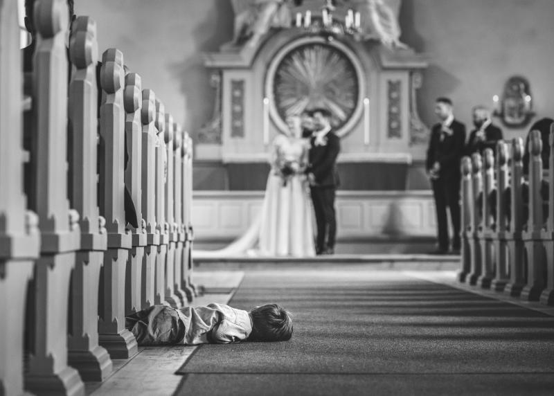 Motivet är ett bröllopspar i en kyrka, under vigseln. Det som gör just detta foto speciellt är en liten pojke som somnat i mittgången.