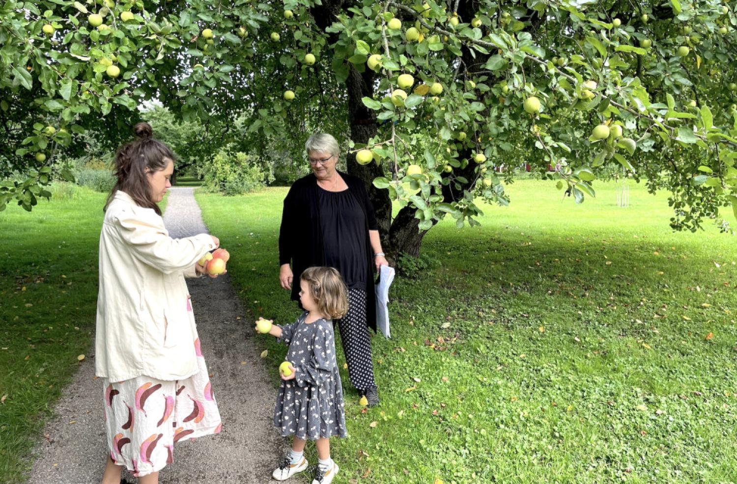 Susanne Ydrebo visar Julias äldsta äppelträd för besökare. Susanne är trädgårdsmästare med högsta ansvar för Nordiska museets trädgårdar, och baserad på Julita.