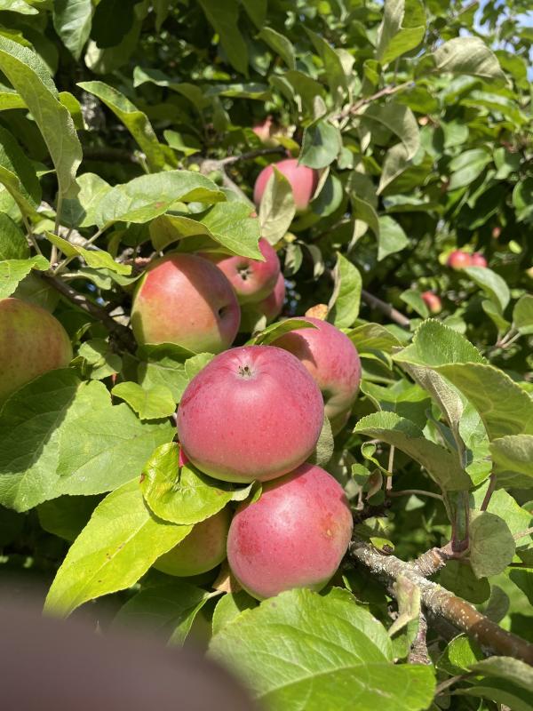 Det är vackert röda äpplen. Jag plockar ett och hugger in, eftersom de mognar i aslutet av augusti och september, berättar Susanne Ydrebo.