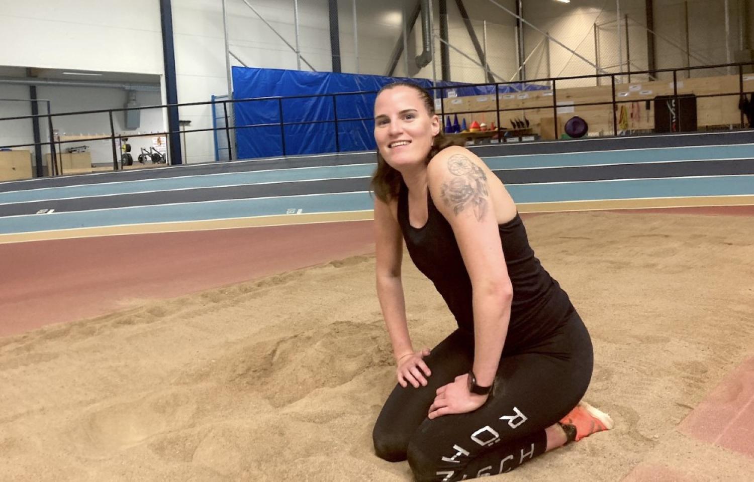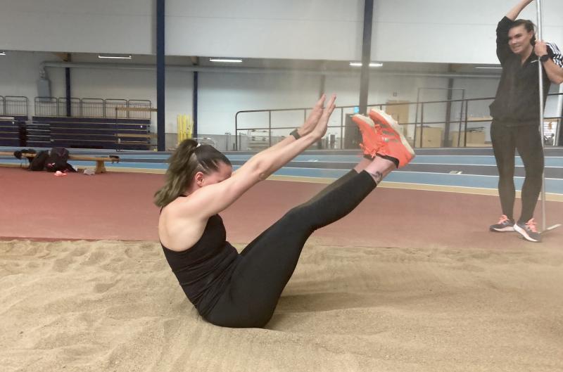 Emma Eriksson i längdhoppsgropen efter ett lyckat träningshopp. Foto: Henrik Östensson