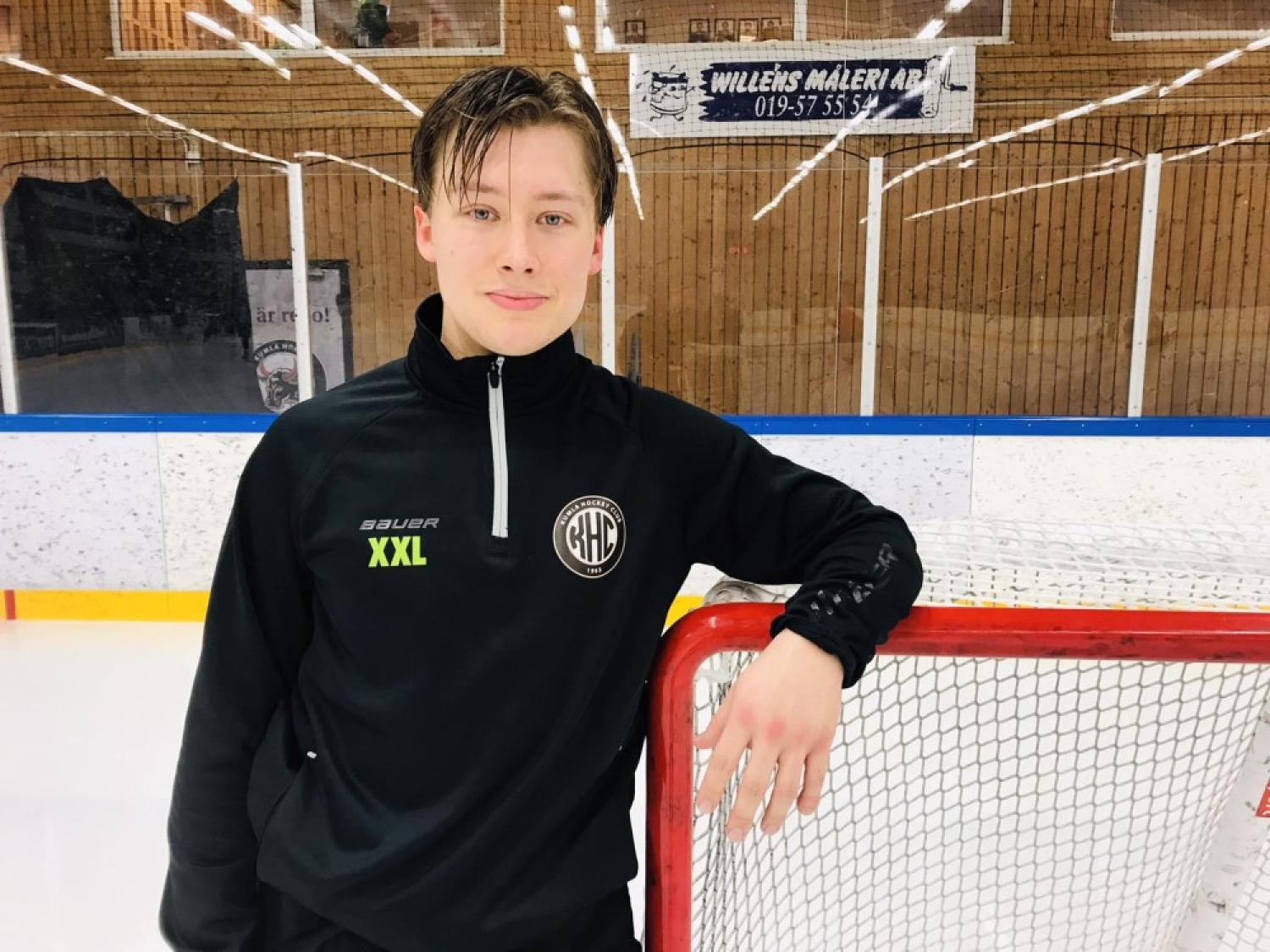 David Harrysson vid det kryss som hans segerpuck mot Fagersta satt i. Foto: Anders Björk