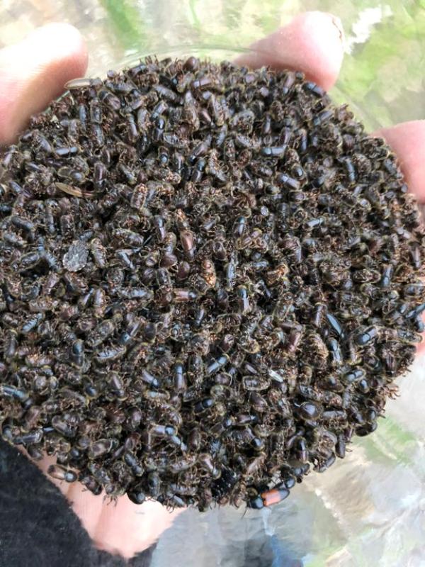 Granbarkborrar som fångats i en fälla. Foto: Skogsstyrelsen
