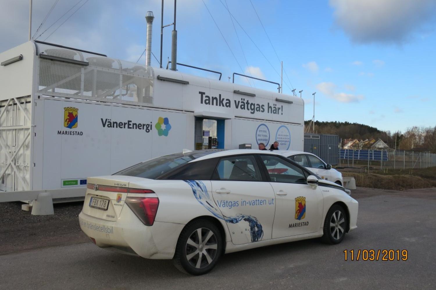Så här ser vätgasmacken i Mariestad ut. Gasen tillverkas på plats, el från solceller. Bilen, förstås en bränslecellsbil.