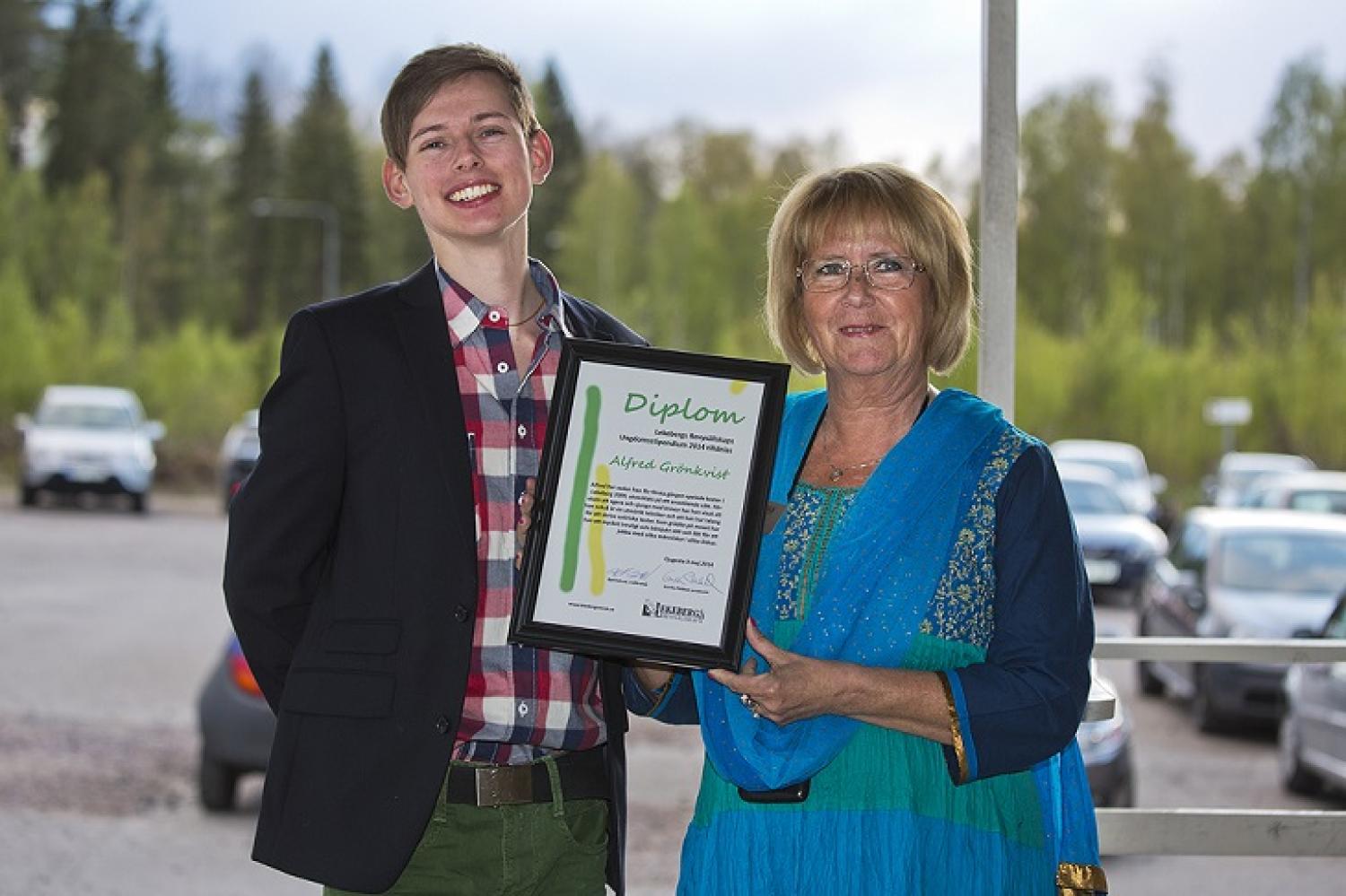 Alfred Grönkvist fick Lekebergs Revysällskaps pris av Gunilla Pihlblad. I sommar spelar han på Lerbäcks teater i Djungelboken. Foto: Sune Eskelinen