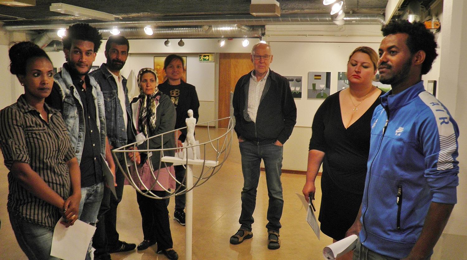 Olle Medin på biblioteket där hans utställning finns att skåda under sommaren. Besökarna är från SFI. Foto: Margareta Swenson