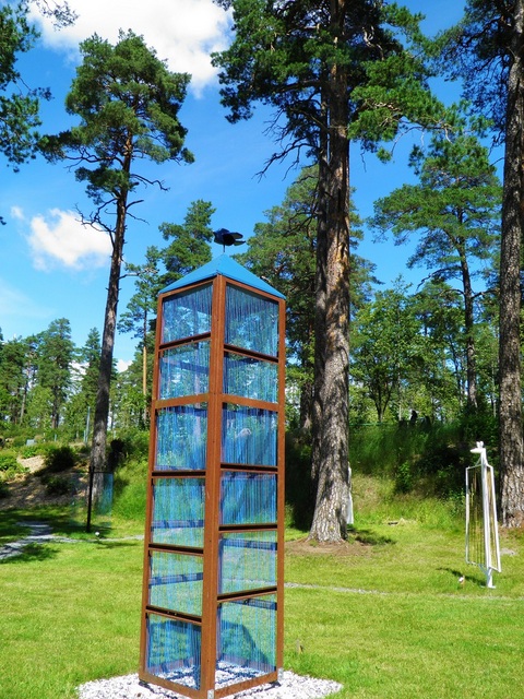 De flesta av skulpturerna i Dr Hannerz Park har stått i Odensbackens skulpturpark förra sommaren, men tre nya verk har tillkommit. Det blå tornet, Fågeltorn, är tillverkat av stålramar till importerade motorcyklar.