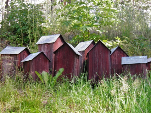 Det kommer att stå kvar i parken, eftersom det köpts in av Laxå Kommun. I gräset högt upp i sluttningen ligger en liten by med faluröda hus klädda med koppartak